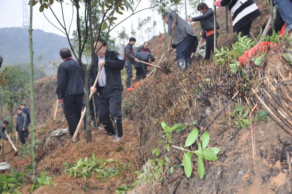 3月12日,溆浦县委书记蒙汉等县领导带领县五大家、县直属机关单位工作人员,共1000余人给仲夏乡桐木坨村高速公路出口处尖坡垴40亩的荒地穿上了"新衣",种下了6680株树苗。
